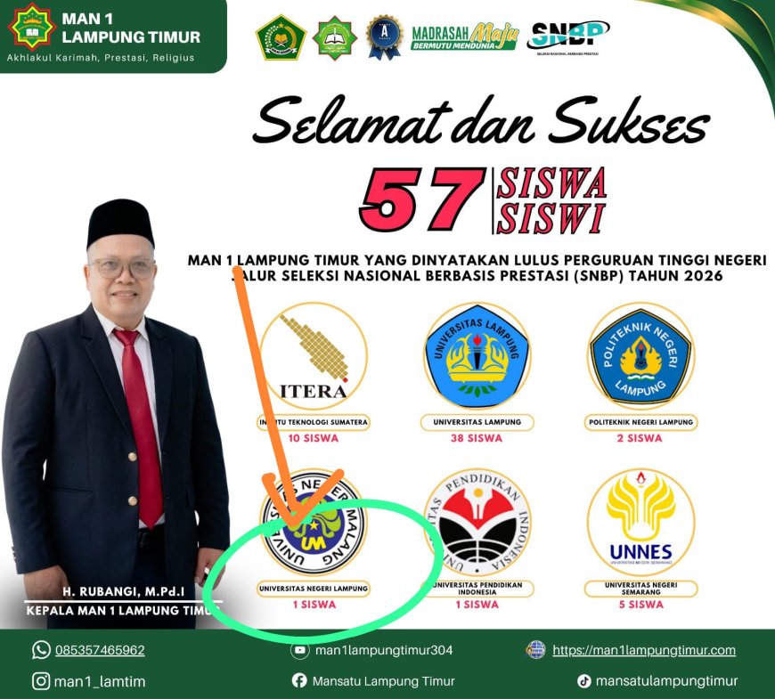"Alhamdulillah, kami keluarga besar MAN 1 Lampung Timur mengucapkan selamat kepada 57 peserta didik yang telah dinyatakan lulus di perguruan tinggi. Ini merupakan capaian yang sangat membanggakan bagi kami," ujar Rubangi, Rabu (1/4/2026).
