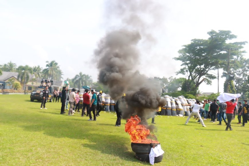 Dalam simulasi tersebut, personel Polres Lampung Timur memperagakan berbagai skenario pengamanan, mulai dari penanganan unjuk rasa hingga situasi darurat lainnya.